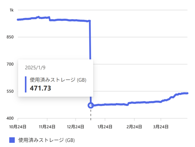 社内でも古いファイルが増えてきて、それらのバージョン履歴が一生消えることもないので、基本的には右肩上がりの状態が続いていました。じわじわと増え続け、2024 年後半~ 2025 年はじめ頃に 950 GB 程度の使用量に達するような状態になっていました。それでも、過去の古いお客様のファイルなど一部のファイルは、作成されっぱなしではなく最終的に削除されるようなケースもあったので、微増と微減の繰り返しをしつつ、長期的には微増し続けているという状態でした。2025 年 1 月 8 日時点では 940 GB の消費という状況で、問題が発生するまでにはまだ時間がありましたが、いずれ問題が発生することは避けられない状況でした。